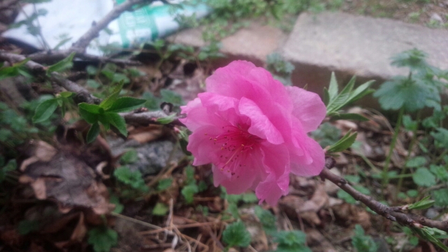 そもそもこのハナモモ、南京桃(=3本のハナモモを接ぎ木して1本にし、1本で3色の花を楽しめる木)として頂いたモノで、その名残で根元にこんな花も。